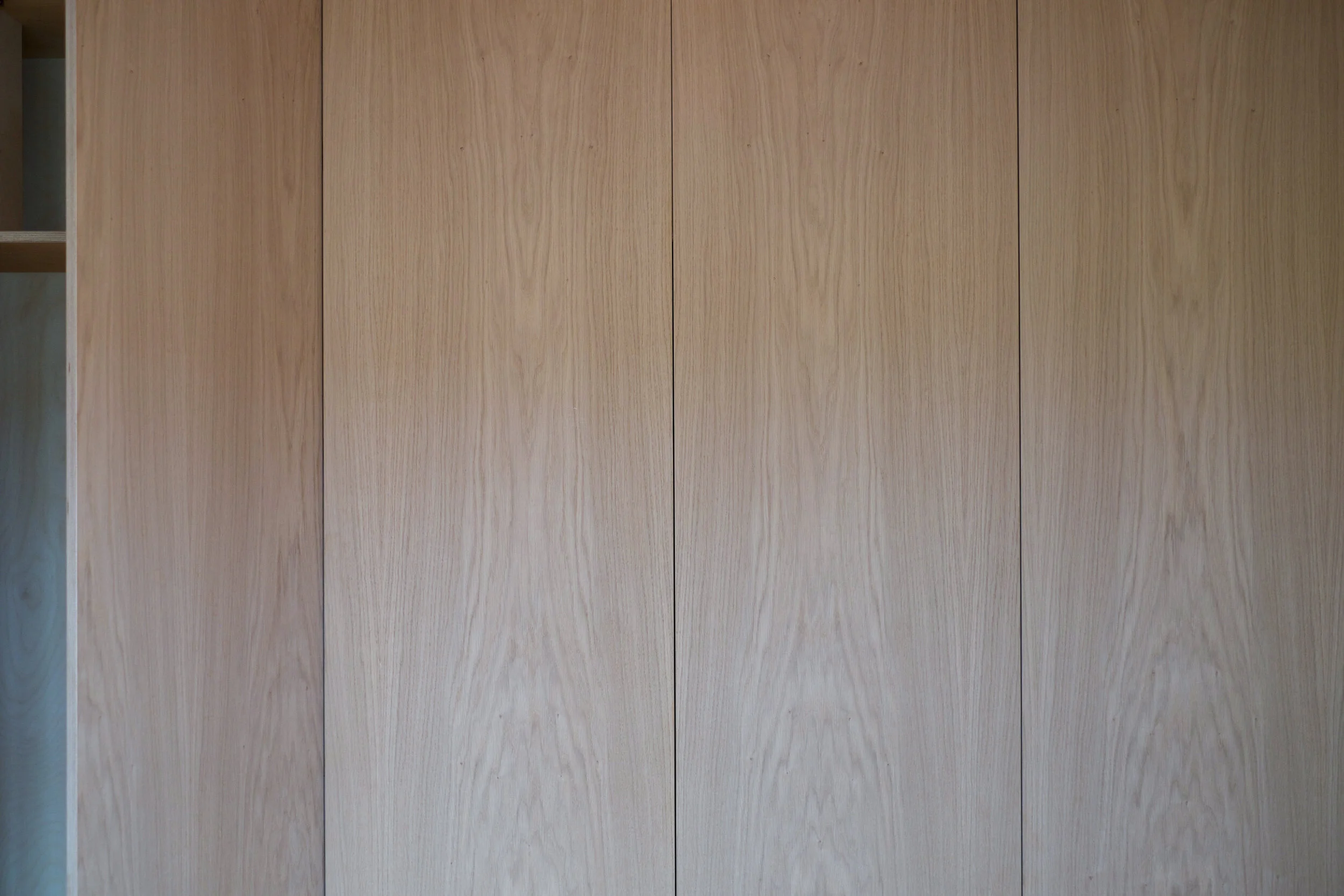 Floor to ceiling bespoke fitted wardrobe, oak veneered birch ply